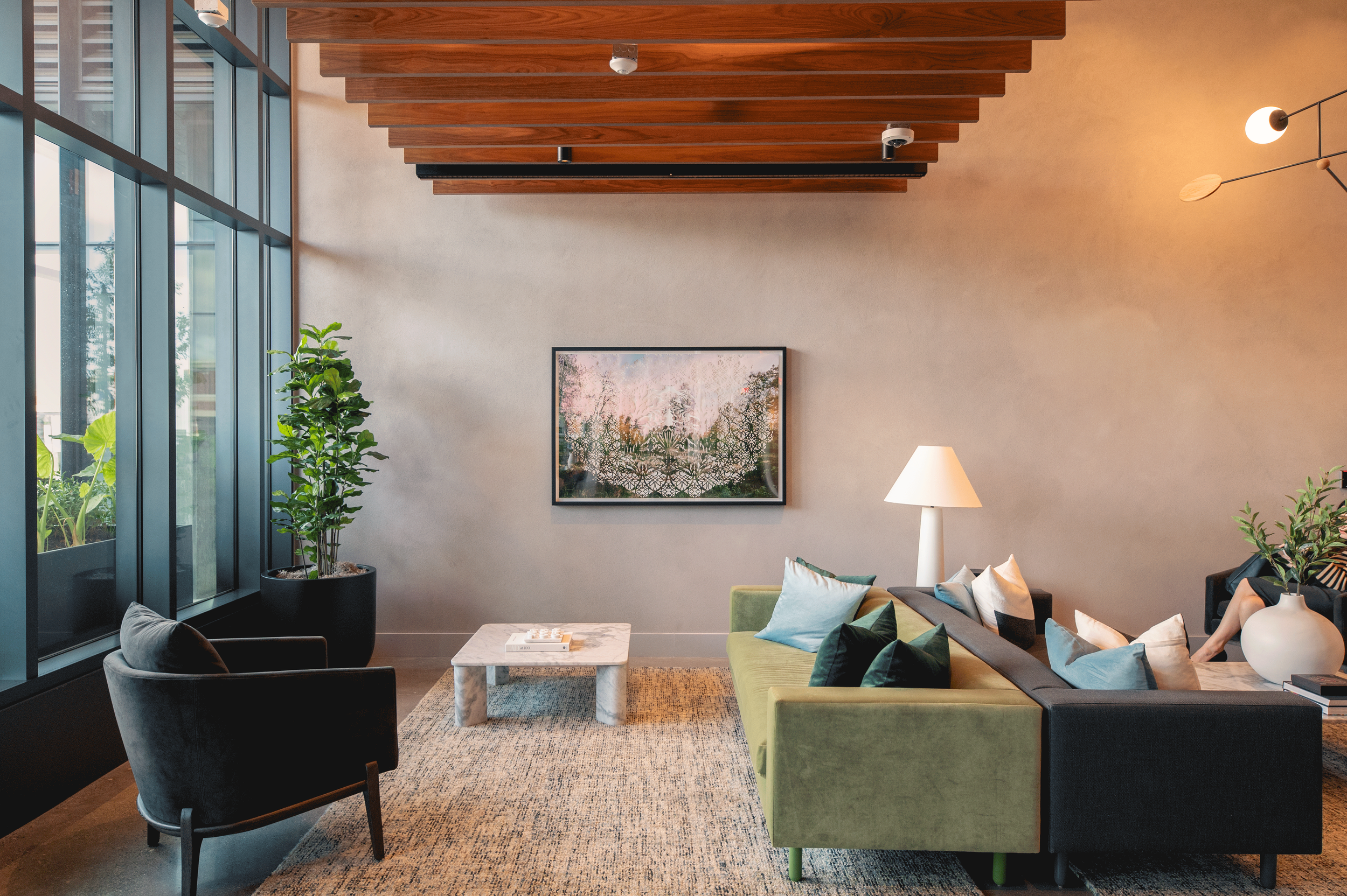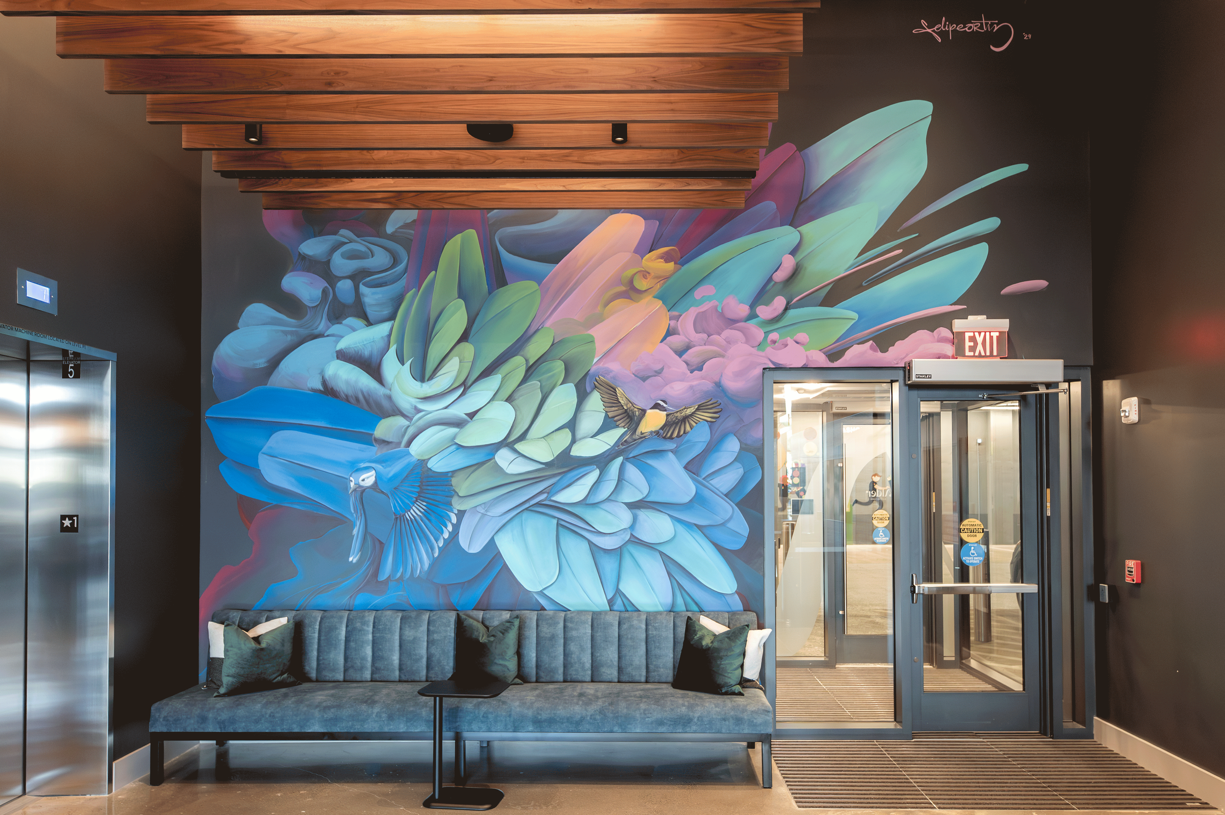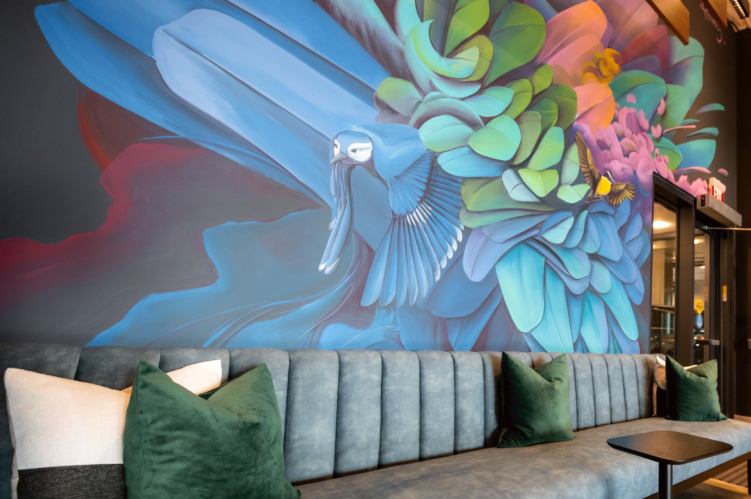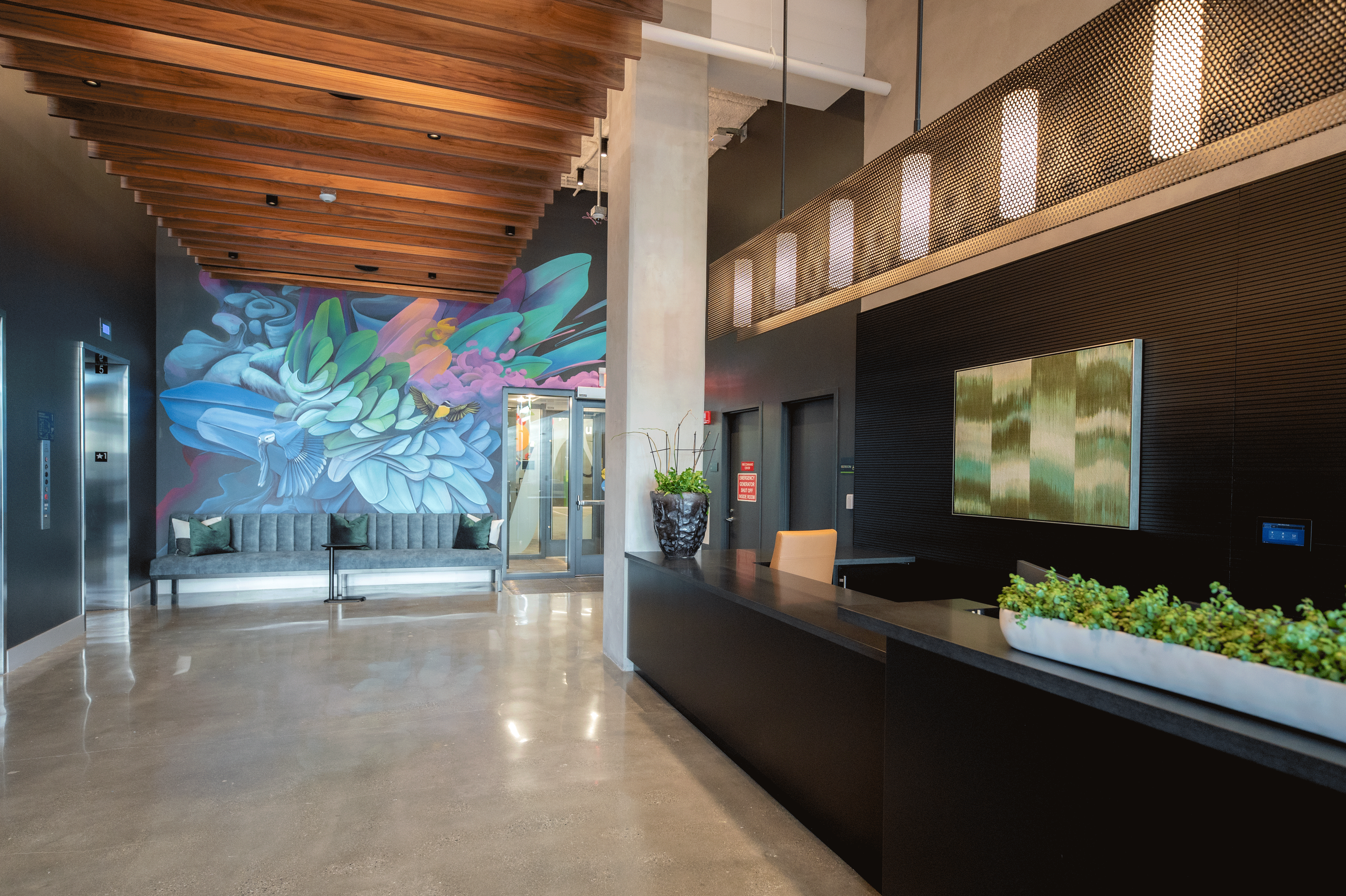 Introducing the Alder at Allston Yards, a multifamily building rooted in community, creativity, and natural surroundings. The artwork aims to embrace the building’s eclectic spirit and organic design. The lobby is brought to life through original artworks and a vibrant custom mural. Local artists are featured throughout the building, capturing Allston’s unique neighborhood and blending themes of art, music, and nature.
