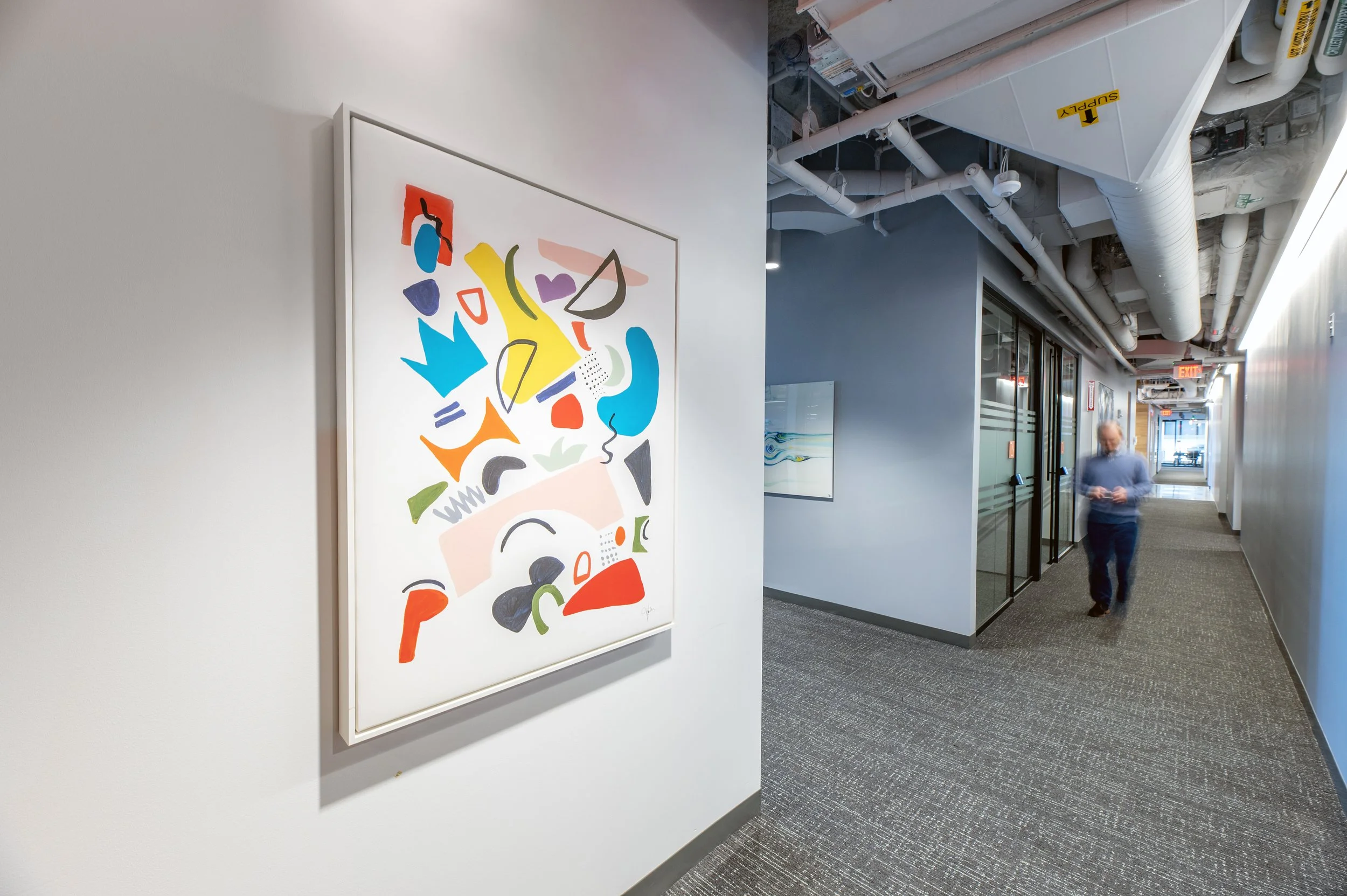 Vibrant colors, energy, and motion are the focus of the lively Verve Therapeutics’ art program. The selected artworks create allusions to the natural world through the perspective of a scientific observer. This playful curation produces an environment that promotes curiosity, discovery, and innovation, bringing the space to life.